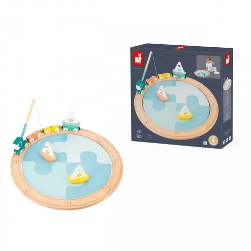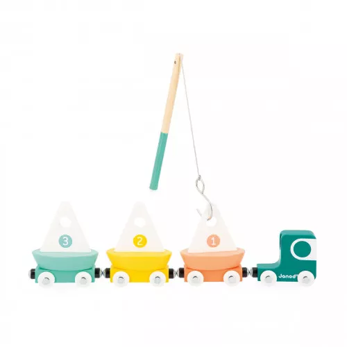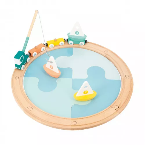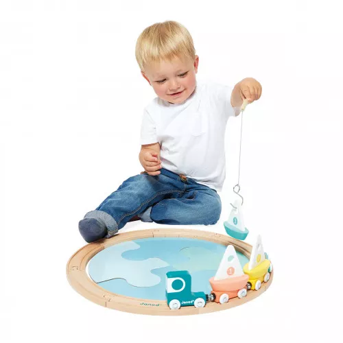 Passons un moment au bord de l’eau en compagnie de nos jolis voiliers en bois aux tons pastel ! Ce jeu d’éveil très complet est idéal pour les enfants à partir de 2 ans qui aiment s’amuser avec tout un tas de véhicules ! Le principe est simple, on commence par constituer la mer grâce à 4 grosses pièces en carton bleu à assembler comme un puzzle, on place les 3 voiliers sur l’eau et c’est parti pour une pêche à la ligne extraordinaire ! Sur le circuit de 8 rails en bois à monter autour de la mer (rails compatibles avec tous les modèles du marché), attendent sagement un super camion et ses 3 wagonnets magnétiques, tous prêts à recevoir nos beaux bateaux ! On charge et c’est parti pour un tour ! Imagination et motricité seront sollicitées pendant de longs moments de jeu ! Astucieux, la canne à pêche se range à l’arrière de la cabine lorsqu’elle n’est pas utilisée. Ce beau jouet d’éveil de la gamme Bolid est fabriqué en bois et en carton certifiés FSC®.