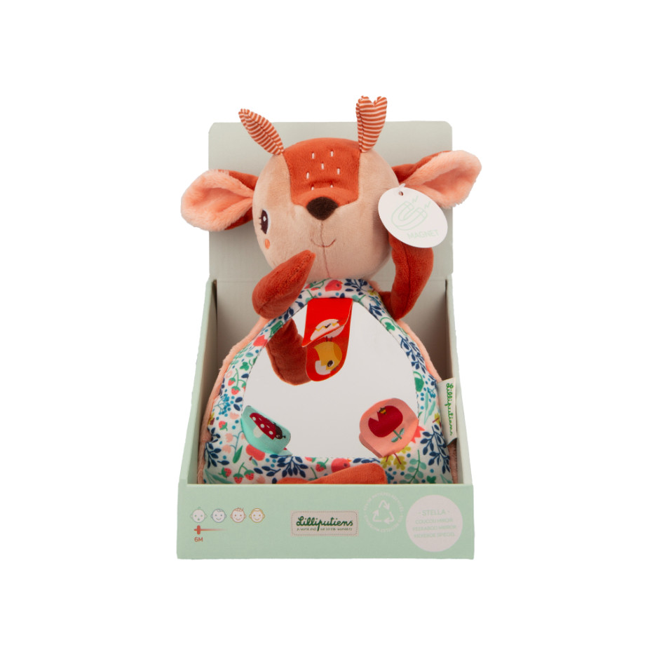 Coucou les bouts de chou ! Stella le faon se décline en jouet à suspendre avec miroir, pour éveiller bébé dès l’âge de 6 mois. Idéal pour stimuler la vue et la découverte de soi, ce jouet d’éveil en peluche fourmille de détails amusants ! D’abord, notre faon est magnétique : les pattes de Stella s’aimantent sur ses yeux pour imiter vos gestes. On parie que, très vite, bébé saura lui-aussi jouer à « Coucou-caché » ! Le grand miroir sur le ventre de la peluche permet de s’observer sous tous les angles, mais ce n’est pas tout : il est agrémenté de 3 étiquettes illustrées des deux côtés, pour dévoiler un reflet amusant ou une surprise lorsqu’on les soulève ! Sur le thème des petits habitant du jardin, voilà un drôle de petit œuf, une amie coccinelle et une jolie fleur à butiner. L’autre atout de ce jouet premier âge, ce sont les petites jambes de Stella que bébé peut saisir et faire crépiter grâce au papier bruissant présent à l’intérieur. Vous pouvez facilement suspendre ce miroir pour bébé à l’aide de l’attache située à l’arrière. Il permet ainsi de stimuler ses sens partout où votre tout-petit se trouve ! Et comment ne pas mentionner l’adorable frimousse de Stella, notre fan joyeux et câlin ? Ses motifs fleuris inspirés du jardin et ses petites oreilles nous font craquer ! Ce jouet magnétique pour bébé mesure 15x20x26 cm et se compose de polyester et de coton. Vous pouvez le laver en machine à 30°. Craquez dès maintenant pour cet adorable cadeau de naissance au service de l’éveil de bébé !