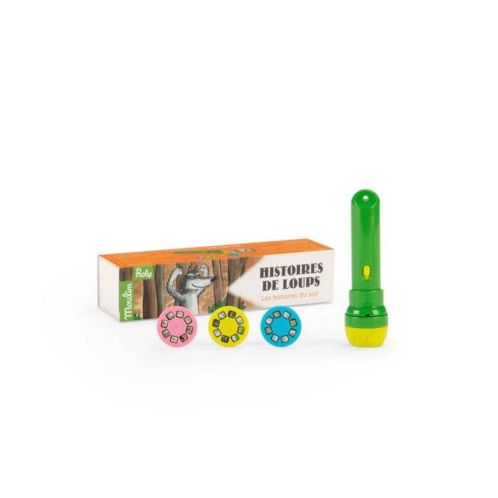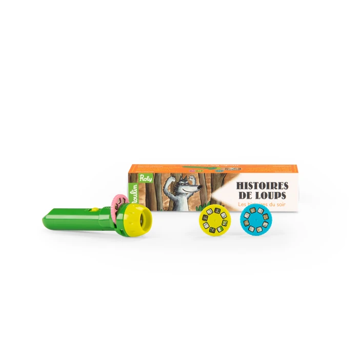 Lampe torche de poche où chacun des 3 disques projetés sur le mur raconte les aventures du Loup, héros de l’école des loisirs, pour imaginer de belles histoires. Collaboration avec la maison d’édition Ecole des loisirs. Auteur et illustrateur : Mario Ramo